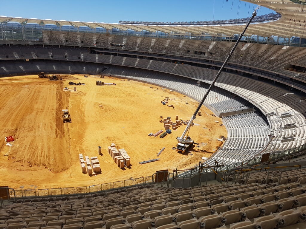 The field is 165 metres long and 130 metres wide, 5 metres longer than both the Melbourne Cricket Ground and Docklands Stadium in Melbourne. It is a multi-purpose facility able to hold not only sporting events such as AFL and major rugby league, rugby union, cricket and soccer games, but also major cultural events such as concerts. In other words, it is huge. Ibex rallied to this supply challenge.