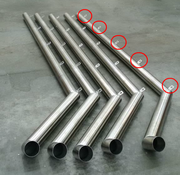 Custom 316L stainless steel down pipes with 3D offsets and mounting lugs.